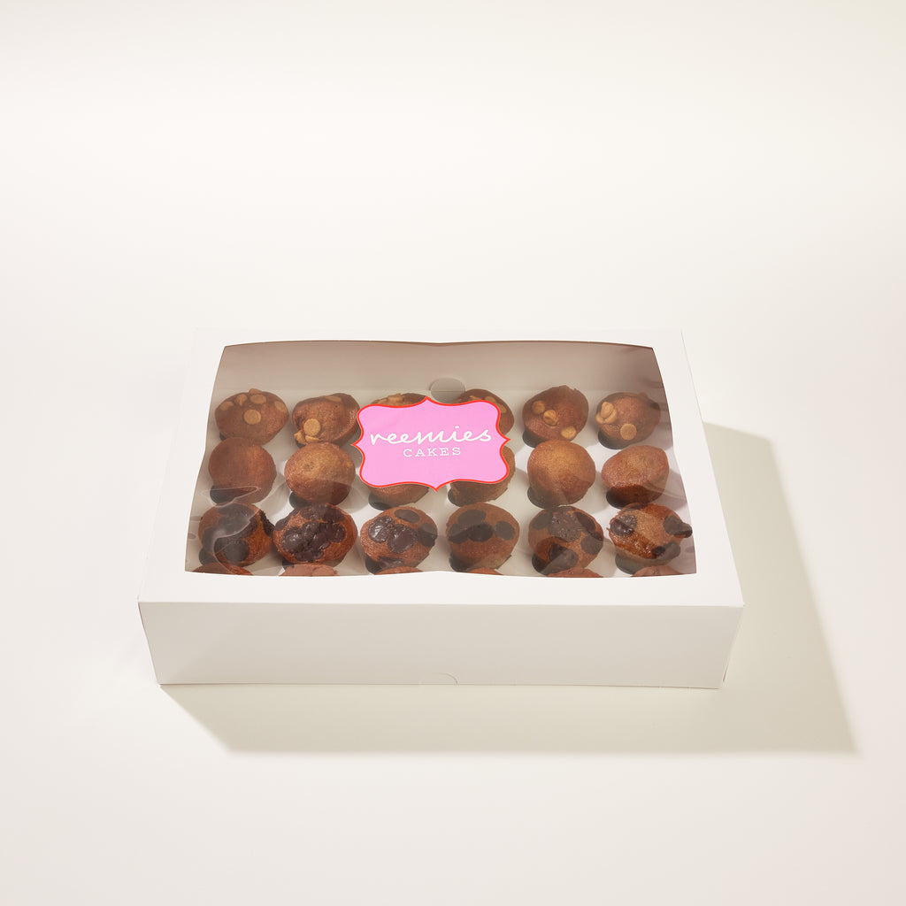 Finally… You’re favourites in bite size! Perfect for parties and events, snacking all day or putting in lunch boxes and snack packs… Your welcome:) Mixed box containing 6 plain, 6 Peanut Butter Chip, 6, Milk Chocolate and 6 Dark Chocolate.